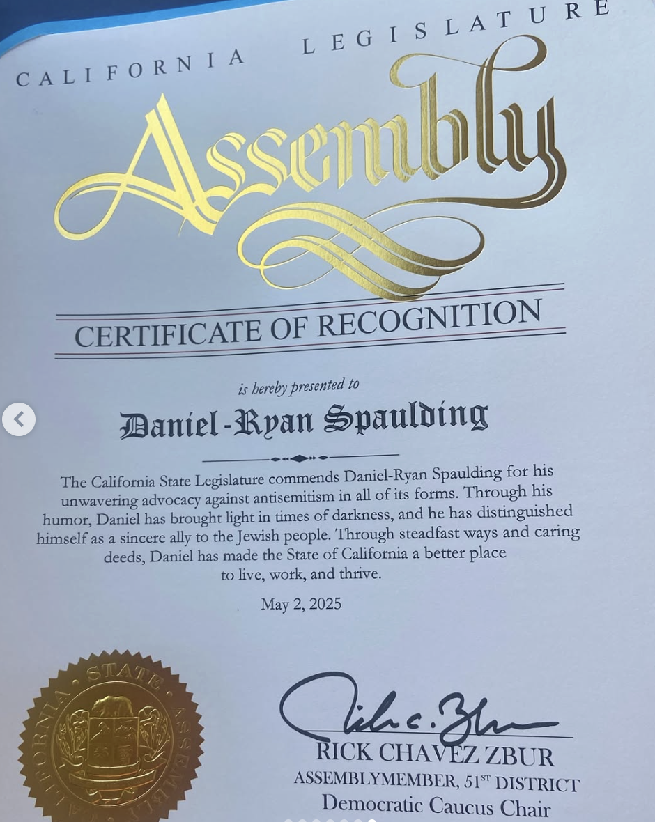 "The California State Legislature commends Daniel-Ryan Spaulding for his unwavering advocacy against antisemitism in all of its forms. Through his humor, Daniel has brought light in times of darkness, and he has distinguished himself as a sincere ally to the Jewish people. Through steadfast ways and caring deeds, Daniel has made the State of California a better place to live, work, and thrive.”